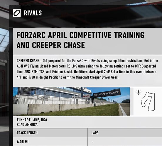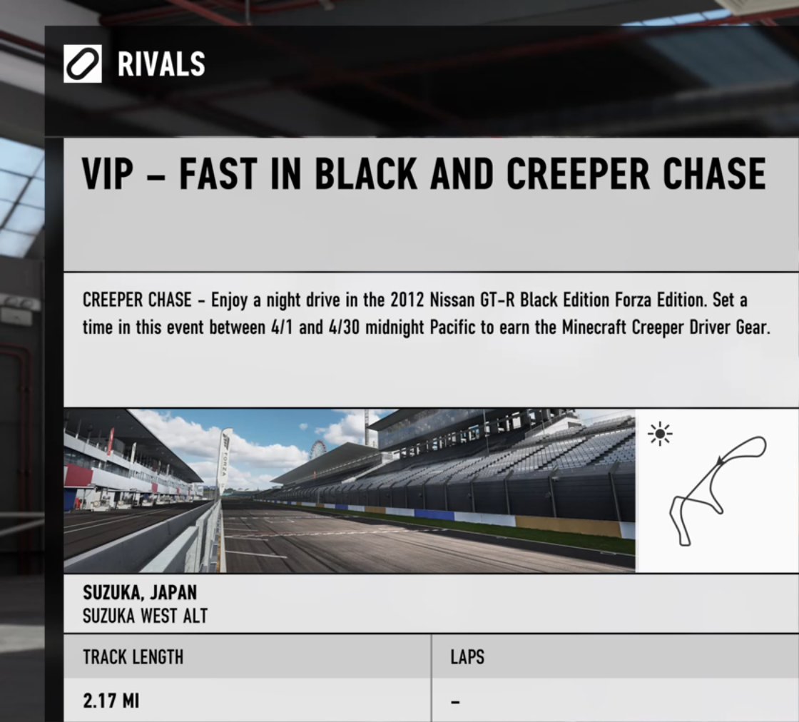 The April Car Pack Challenge and Creeper Chase event was added to Featured Rivals on April 19th. Set a time in this or any other “Creeper Chase” event (in VIP and ForzaRC Rivals menus) to earn the Creeper Driver Gear suit.