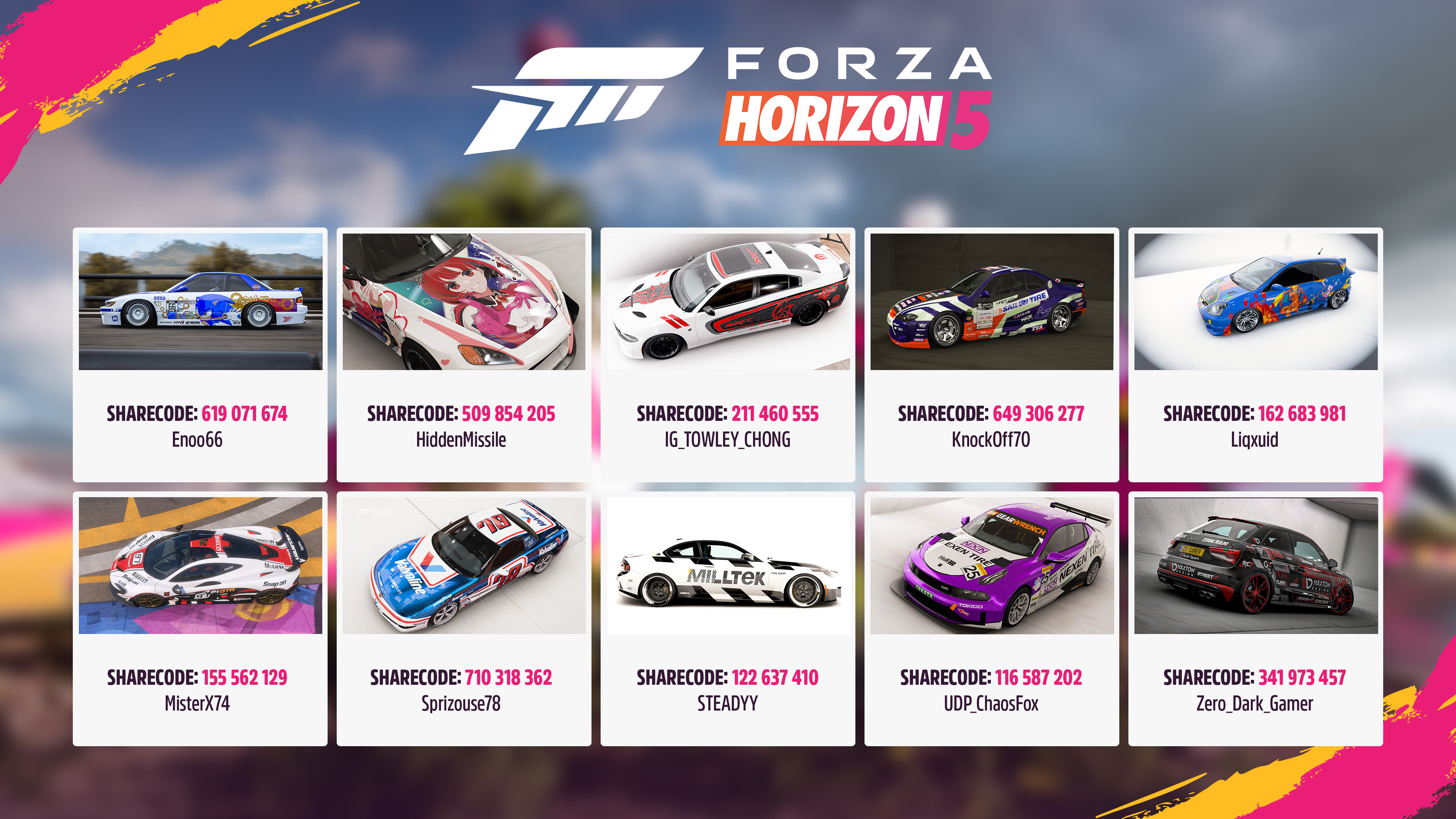 Submit your entries for a chance to be featured in game and win a car of your choice!