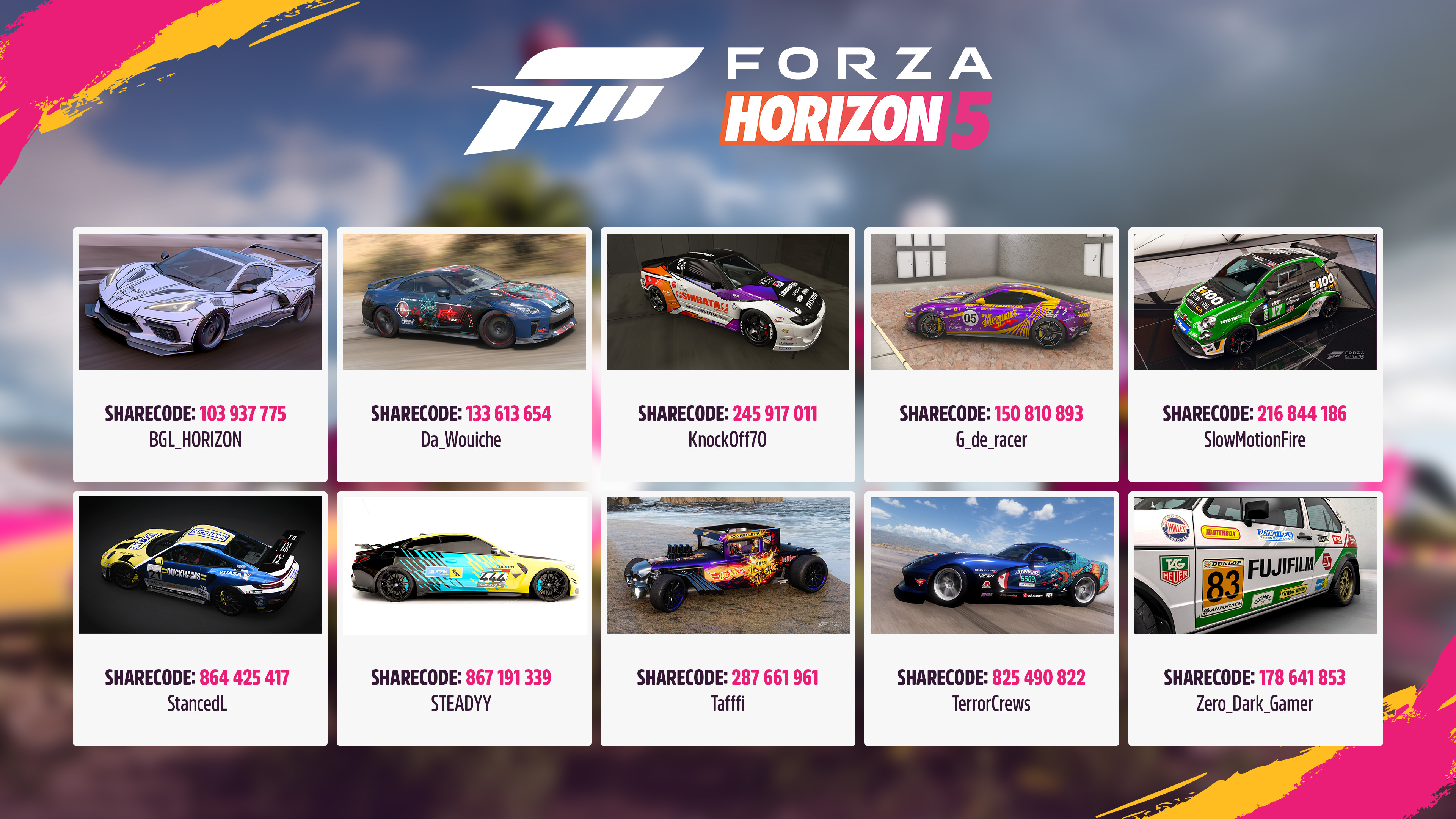Submit your entries for a chance to be featured in game and win a car of your choice!
