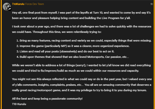 It is disappointing considering how Rennsport and PMR both didn’t hit the mark. This is a prime opportunity for Forza to deliver new content and get people excited again. Releasing Fujimi and the associated car pack seemed like things were headed in the right direction. Certainly seems like the game is dead now but maybe 2026 will bring a Cyberpunk 2nd wind type of update that addresses a lot of issues and turns the franchise around. Sim racing whether its hardcore or simcade is very popular right now and every title has noticeable pros and cons. MS should not abandon the genre just to do Horizon.
