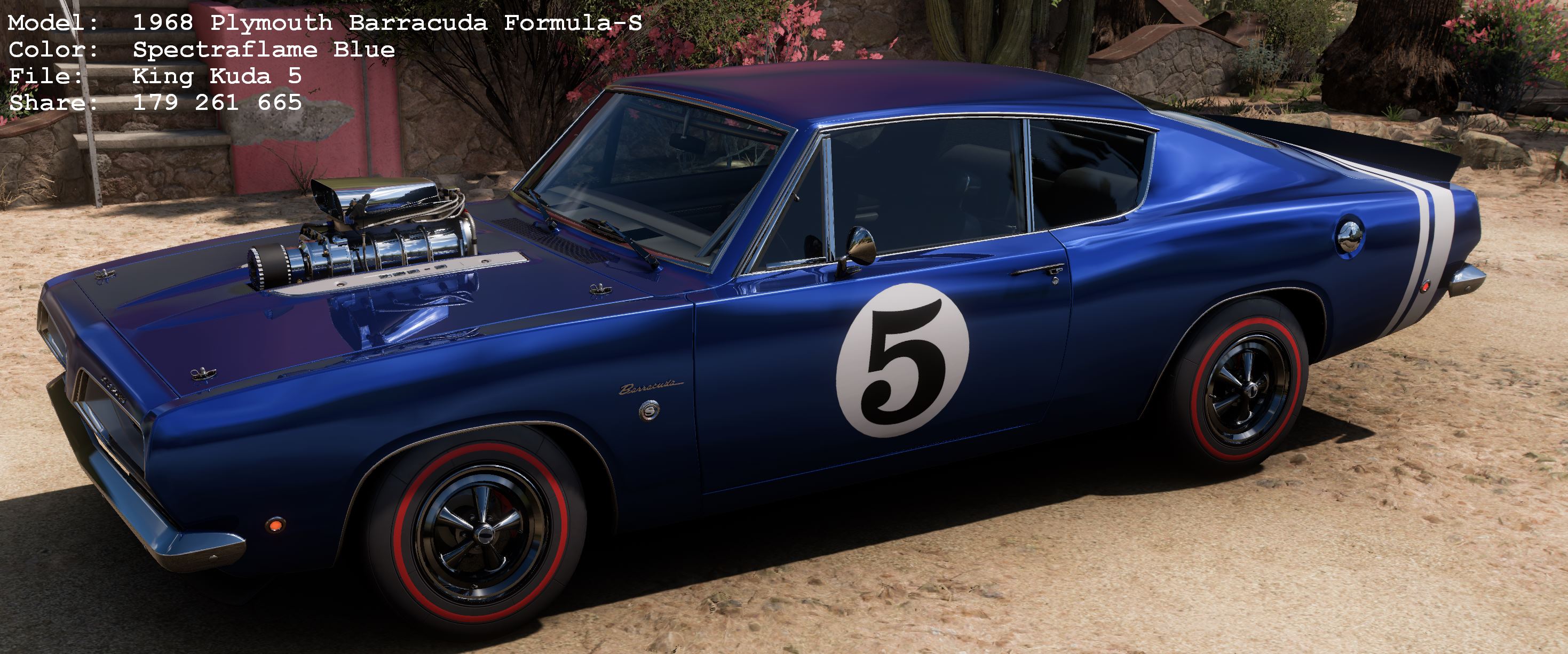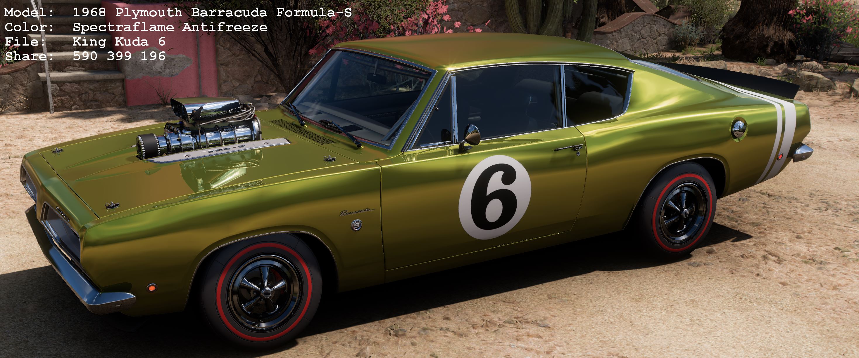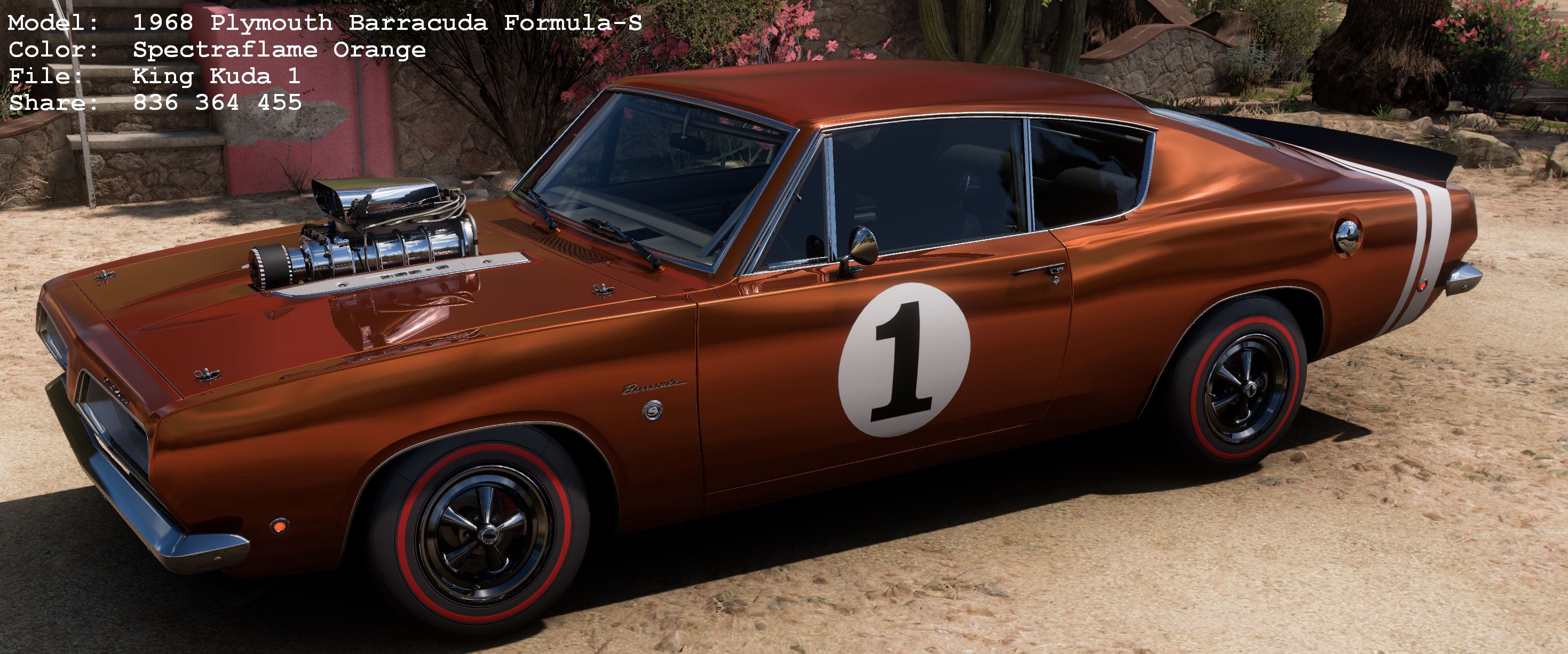 The King Kuda was the Spoilers Series recast of the original Custom Barracuda with blown motor and, err, spoilers. Available in a selection of simulated Spectraflame colors and numbers. Tune is also available with share with share code 154 514 285. The tune could probably be improved.