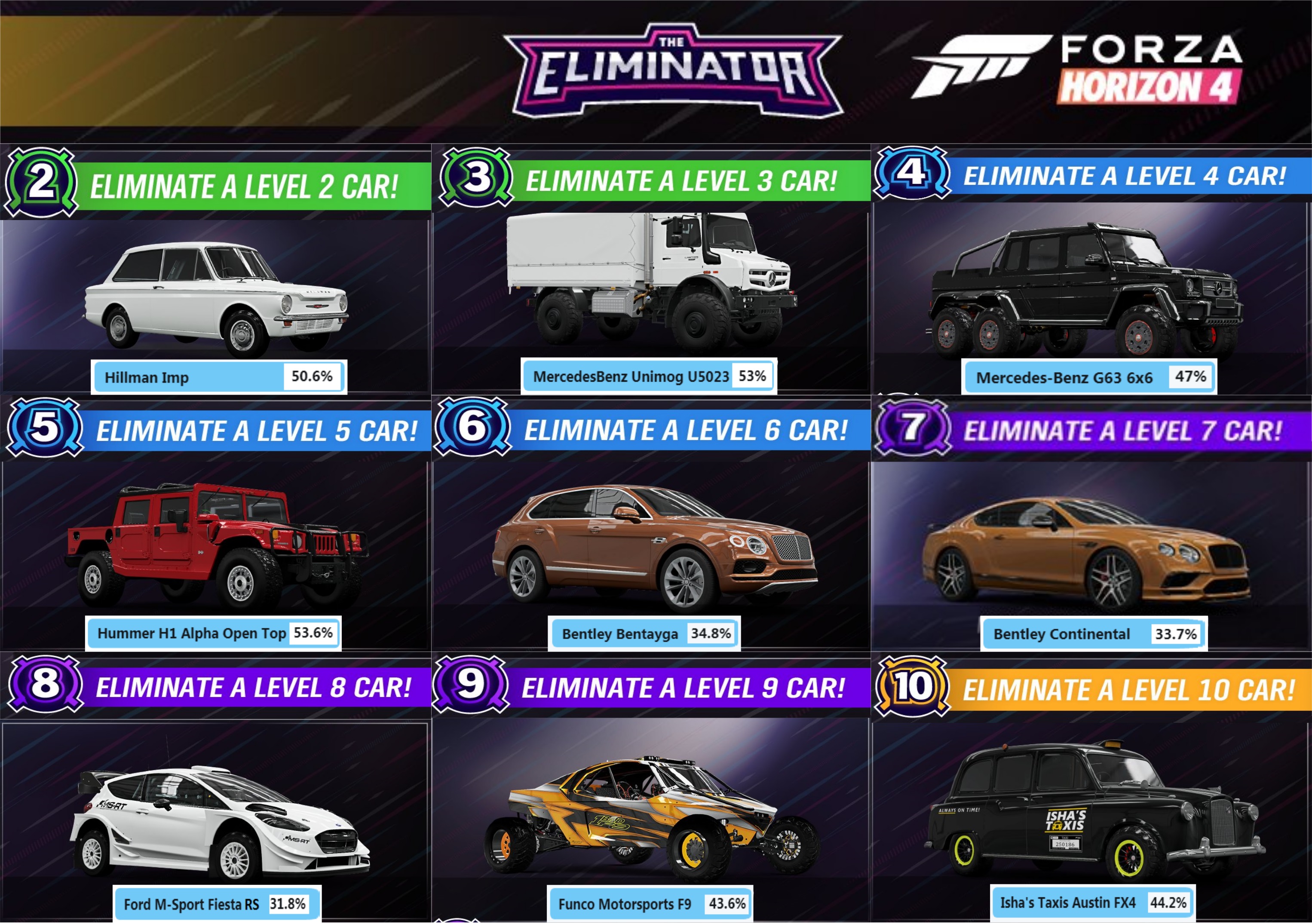 Many cars removed from the Eliminator, no clue why they aren’t replaced with something else. They should’ve removed Ferrari and Lambo’s rather than offroad cars. The Eliminator is mostly a cross country / offroad mode - just give me the CJ5 or a Defender on lower tiers!
